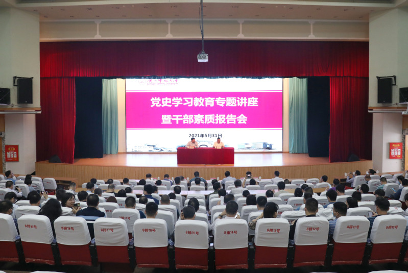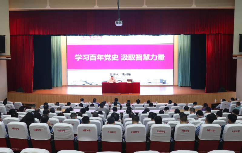 5月31日上午,我校在育才校区田家炳教育书院一楼报告厅举行党史学习教育专题讲座暨干部素质报告会。报告会邀请山东省政协副主席、山东师范大学党委书记、二级研究员唐洲雁同志为我校党员干部作了题为《学习百年党史汲取智慧力量》的专题报告。报告由校党委书记邓军主持,校长贺祖斌出席报告会。校领导旷永青、赵铁、黄文韬、莫坷,校党委常委林国庆、黄海波出席报告会。学校副处级及以上干部参加了报告会。