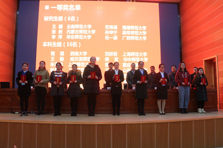 我校参赛队伍由王小禹老师和覃彩连老师带队,2014级地理科学学生何秋玲和2017级研究生伍一涵组成参赛队伍。经过一天的激烈角逐,通过抽签定场地、赛前一小时抽签定题、一小时完成教学设计及课件制作、教学展示、答辩等环节的比赛,选手伍一涵荣获全国第四届全国地理师范生教育技能大赛一等奖,指导教师王小禹老师和王月老师获得优秀指导教师奖。