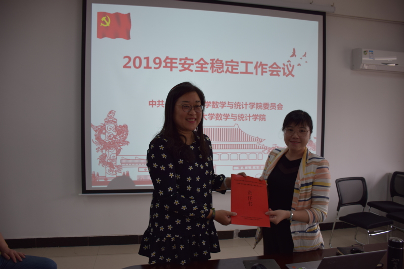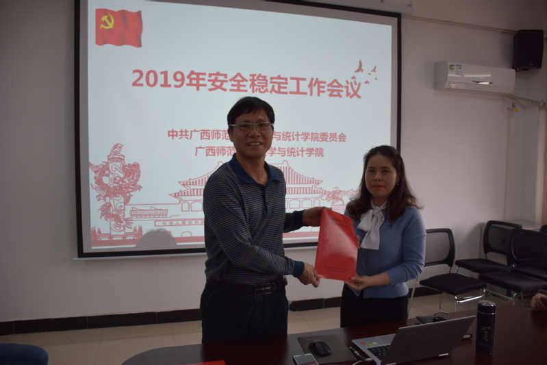 最后,学院主要负责人与班子成员、院领导与联系分管科室主要负责人分别签订《数学与统计学院2019年安全稳定工作责任书》,逐级落实学校和学院稳定、安全、消防、防传销等安全稳定工作的责任,为学院的稳定局面形成保驾护航。