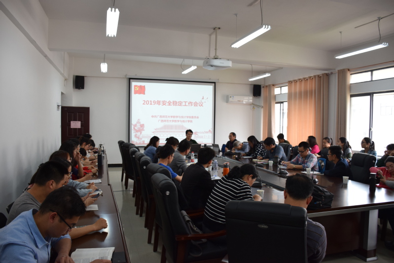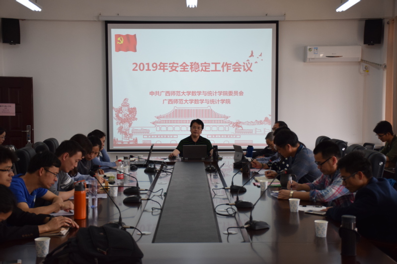 为了进一步学习贯彻习近平总书记对安全稳定工作的系列重要指示精神,全面贯彻全国、全区教育系统安全稳定工作电视电话会议的部署要求,4月19日,数学与统计学院在我校雁山校区行政南楼6楼学院608会议室组织召开了学院2019年安全稳定工作会议,学院党政领导班子、院长助理、党委委员、支部书记、工会主席、分团委书记、办公室主任、全体辅导员、学生安全信息员参加了会议。