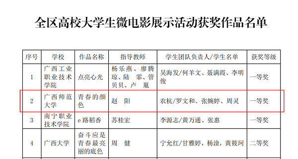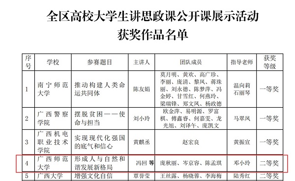 9月17日,由马克思主义学院邓小玲老师指导,2016级思想政治教育本科生冯回主讲的思政公开课《形成人与自然和谐发展新格局》在全区高校大学生讲思政课公开课展示活动中获得二等奖。马克思主义学院赵阳老师、电子工程学院贾越峰老师指导,由马院本科生自编自导,两个学院的学生参演制作的微电影《青春的颜色》,在全区高校大学生微电影展示活动中获得一等奖,并代表广西高校参加“我心中的思政课”——全国大学生微电影展示活动。