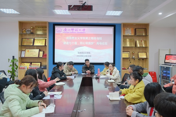 为回顾新中国成立七十年来的发展历程,展示广大人民群众在建设中国特色主义社会过程中敢于拼搏、奋发有为的良好精神风貌,2019年12月30日,马克思主义学院第三期青马班在雁山校区行北362会议室举办“奋进七十年,同心筑国梦”青马论坛。本次论坛由团支书廖燕群主持,青马班全体成员参加了本次论坛。