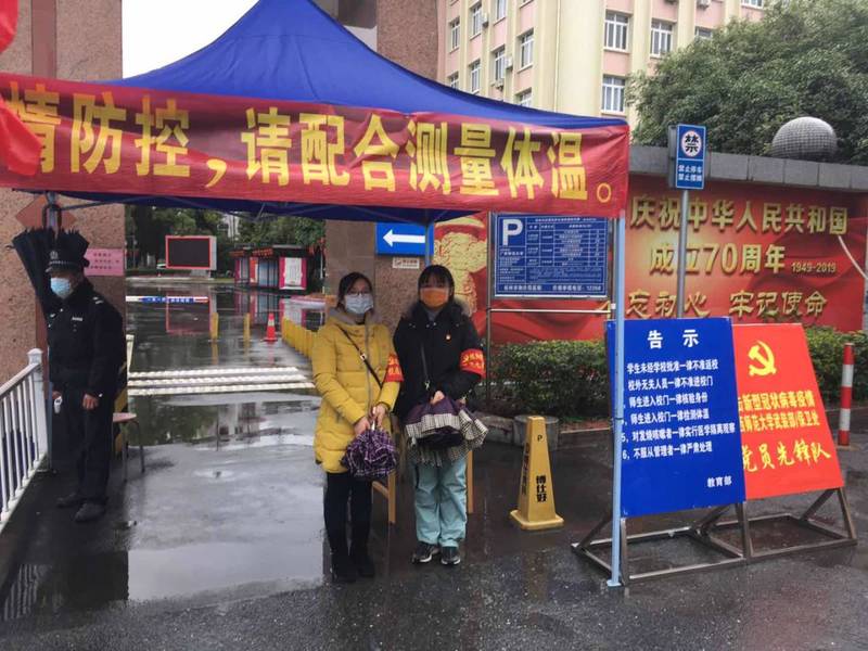 同志们不畏寒风疾雨,佩戴着党徽、口罩和执勤红袖套,同保卫处安保人员一同站在了学校防范疫情的第一线。值班人员协助安保人员对各门岗进出车辆、人员检查和体温检测并做好登记,发现异常及时处置并上报,耐心细致做好师生进出服务工作,对师生意见和建议及时解答。与此同时,另有3名党员到校防控领导小组指挥部条件保障与安全管理组协助做好新冠疫情数据收集、整理和上报工作。