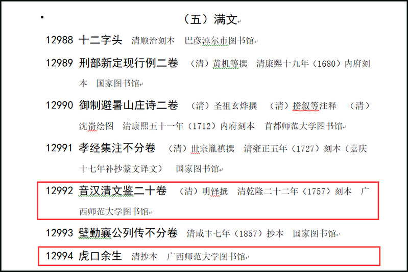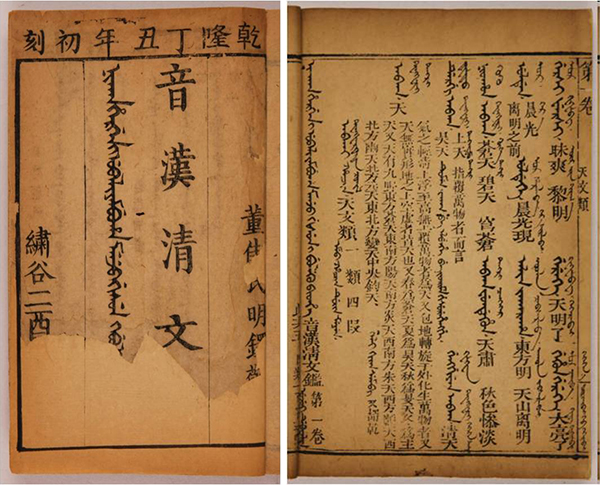 此次入选《国家珍贵古籍名录》的两种古籍分别是清刻本《音汉清文鑑》和清抄本《虎口余生》,均属满族文字古籍。《音汉清文鑑》是满汉合璧注解词典,本校图书馆所藏为清乾隆二十二年(1757)年刻本,共分二百八十类,约收词语一万二千三百条,涵盖了清朝政治、经济、军事、法律、天文、地理、风俗、习惯、医学、宗教、文化等各方面的用语,所有词语均以满文、汉文双语标注,便于对照学习;馆藏此本在行间还提有蒙文标注,应为古人在翻阅时所提,充分显示了清初多民族融合的风貌,具有重要的版本和文献价值。《虎口余生》是明末清初戏曲传奇,仅有抄本传世,本校图书馆所藏为清代抄本,其正面为抄本《虎口余生》,背面为明万历刻本《天中记》残卷;此本中凡满清人物出场,均标注满文,并用汉文注音,在传奇文本形式上也有特殊之处,是该传奇文本流传过程中的重要发现,具有较高的文献价值。
