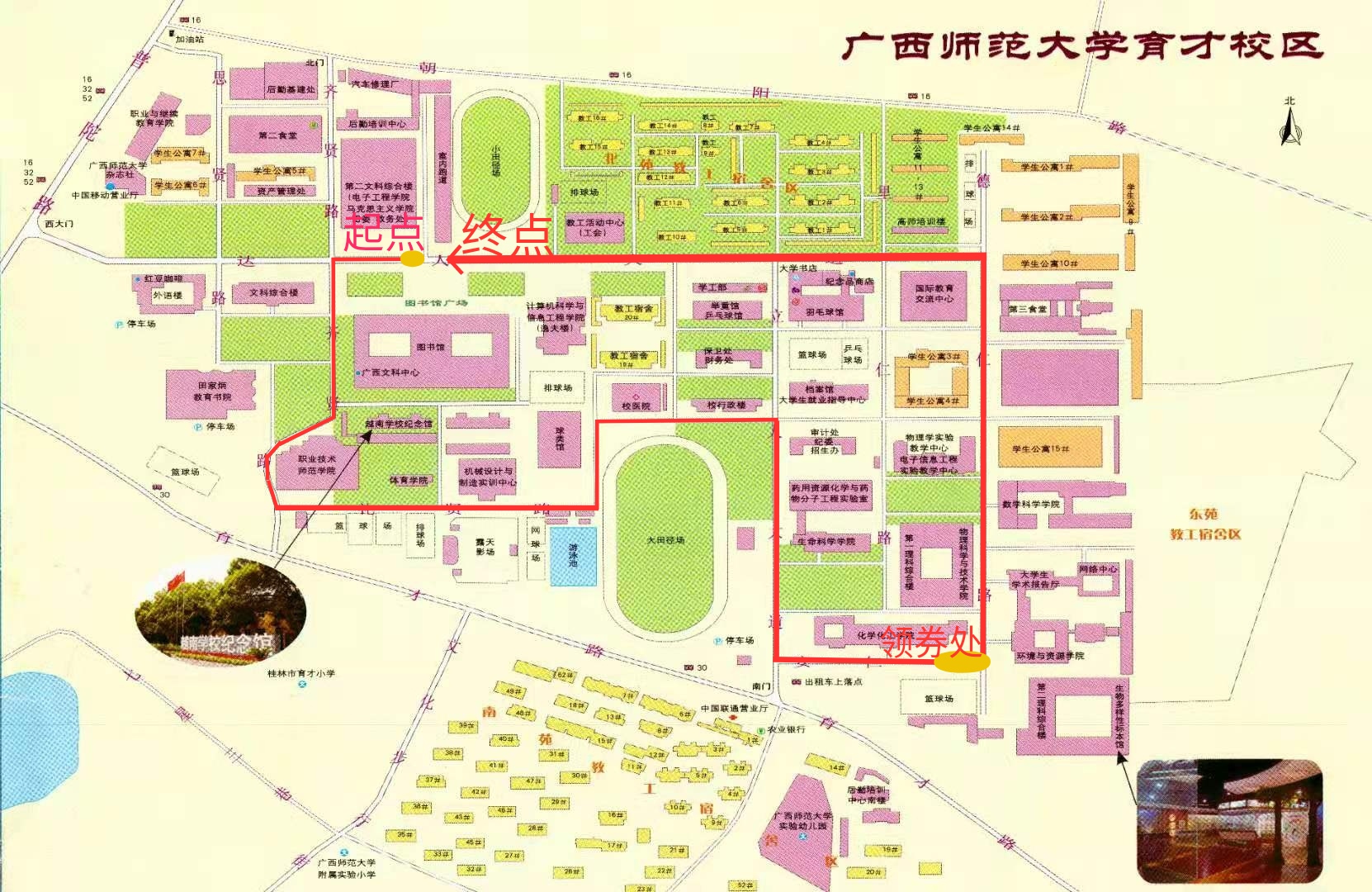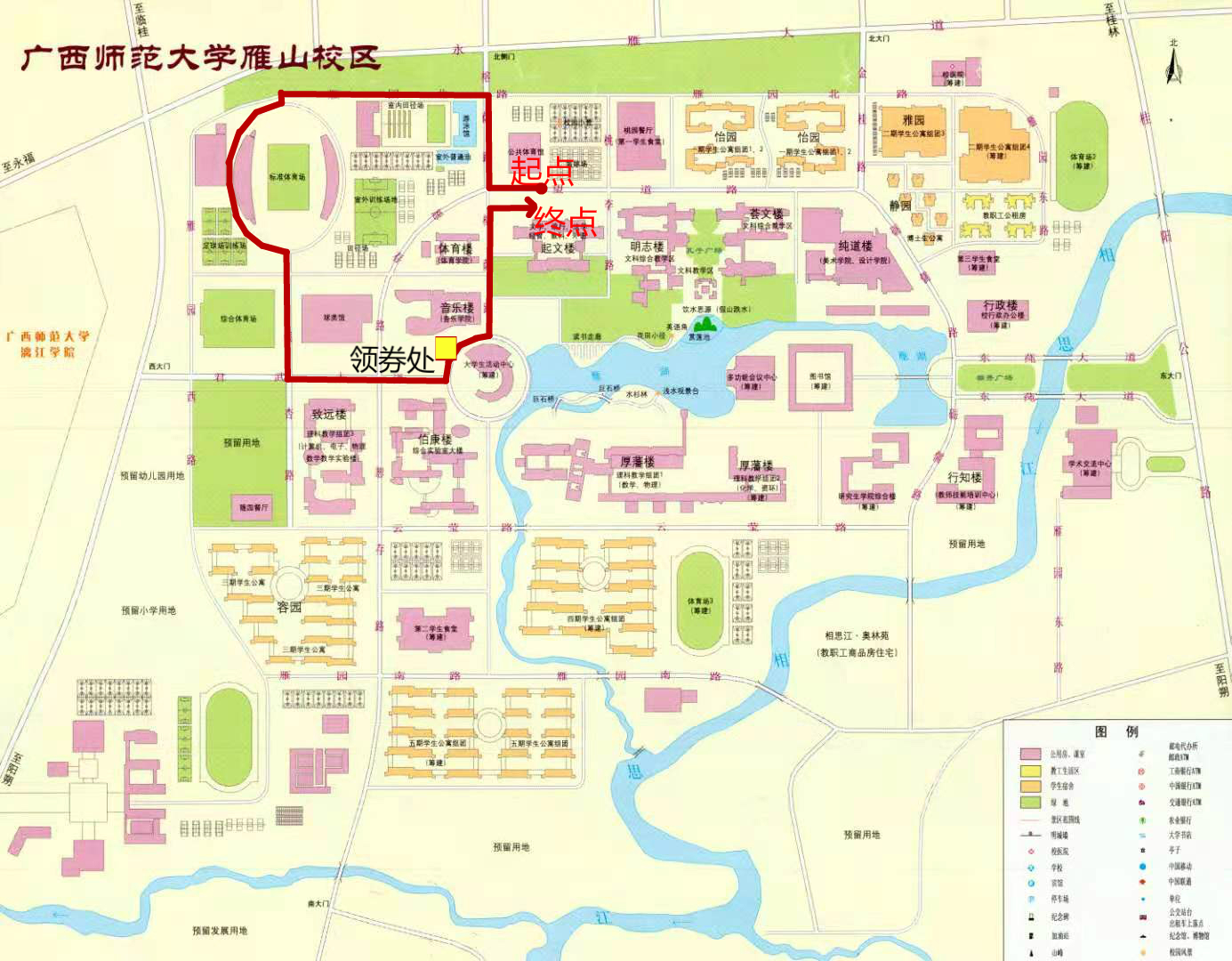 2、雁山校区:(起点)雁山校区起文楼—雁园北路—游泳馆北面—田径场西面—体院球类馆(西面)—君武大道—音乐楼前—起文楼(终点),工作人员将在音乐楼前发放活动券,一人一券,参加活动的教职工到终点(起文楼前)凭券签字领取纪念品,不参加活动者不得领取纪念品(严禁代领)。