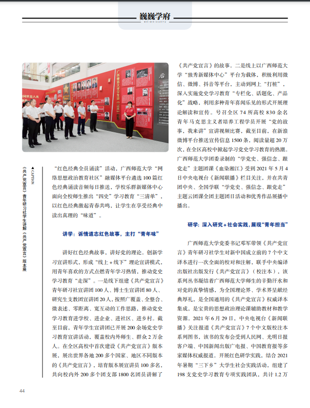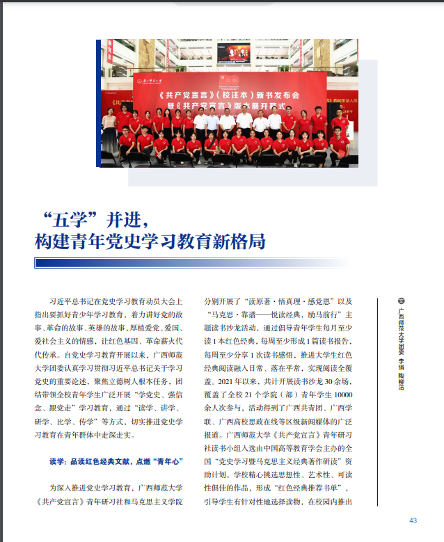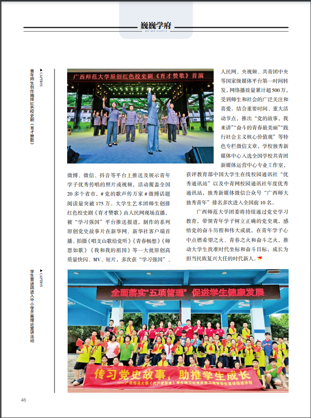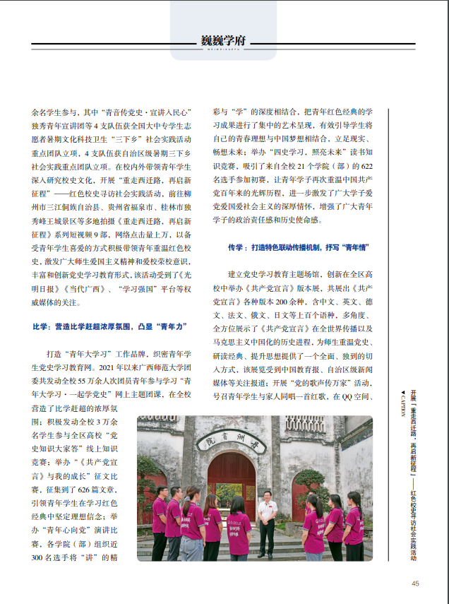 近日,共青团广西区委主办杂志《金色年华》以《“五学”并进,构建青年党史学习教育》为题,从“读学:品读红色经典文献,点燃‘青年心’”;“讲学:诉情道志红色故事,主打‘青年味’”;“研学:深入研究+社会实践,展现‘青年担当’”;“比学:营造必学赶超浓厚氛围,凸显‘青年力’”及“传学:打造特色联动传播机制,抒写‘青年情’”五个方面,关注报道我校青年党史学习教育创新实践经验做法。