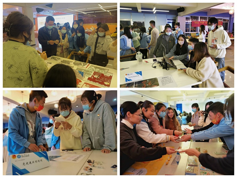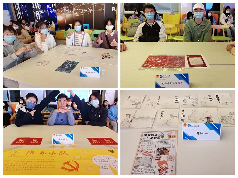 伴随着昂扬奋进的团歌,活动正式拉开帷幕。来自不同学院的八个商家团队热情地向消费者展示前期制作的成品、现场创作的商品以及沉浸式体验服务,生动地讲述团队的创业思路、创新想法,详细地介绍售卖商品与党史、新中国史、改革开放史、社会主义发展史的巧妙结合之处。有的利用精湛的剪纸技术剪裁出具有代表性的“四史”事件场景的作品;有的商家通过现场作画的形式创作富有里程碑意义的历史事件的水墨画;有的商家利用PPT技术制作沉浸式党史故事角色体验游戏,带领消费者感受当年中国共产党正确的战略路线……消费者则凭借通过党史知识答题赚取的初始虚拟货币,根据个人意愿消费、购买商品。现场氛围热烈,成员情绪高涨。通过90分钟的积极售卖,八个团队均取得不错收入。最终,第四团队以267“元”收入摘得本次模拟集市销售冠军。
