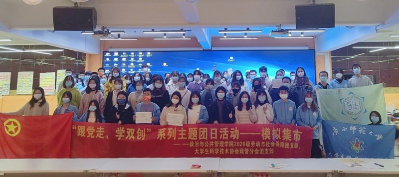 为深入贯彻落实习近平总书记在庆祝中国共产党成立100周年大会上的重要讲话精神,培养新时代大学生“敢闯会创”的综合素质能力,2020级劳动与社会保障团支部、大学生科学技术协会政管分会团支部于12月10日联合举办“跟党走·学双创”模拟集市主题团日活动。学院团委副书记、2020级辅导员,2020级劳动与社会保障专业班主任,2020级兼职辅导员及广西师范大学科学与技术协会代表出席活动。