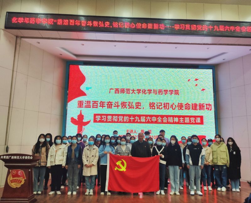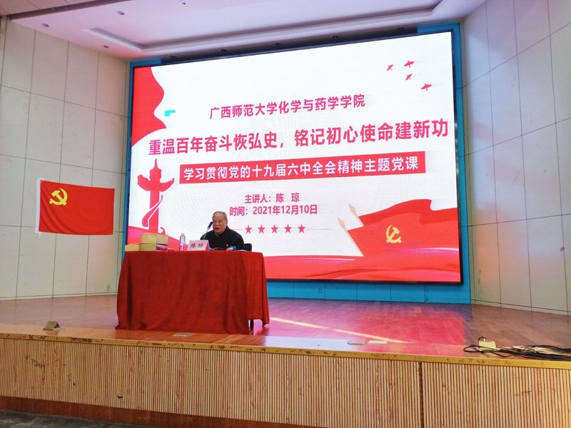为进一步深刻学习贯彻党的十九届六中全会精神,12月10日,化学与药学学院党委邀请“光荣在党50周年”纪念章获得者、享受国务院颁发的政府特殊津贴专家、广西师范大学第一位获得区级自然科学奖励的陈琼同志在大学生学术报告厅讲授“重温百年奋斗恢弘史,铭记初心使命建新功——学习贯彻党的十九届六中全会精神”专题党课。学院党员和入党积极分子共计一百余人参与学习。