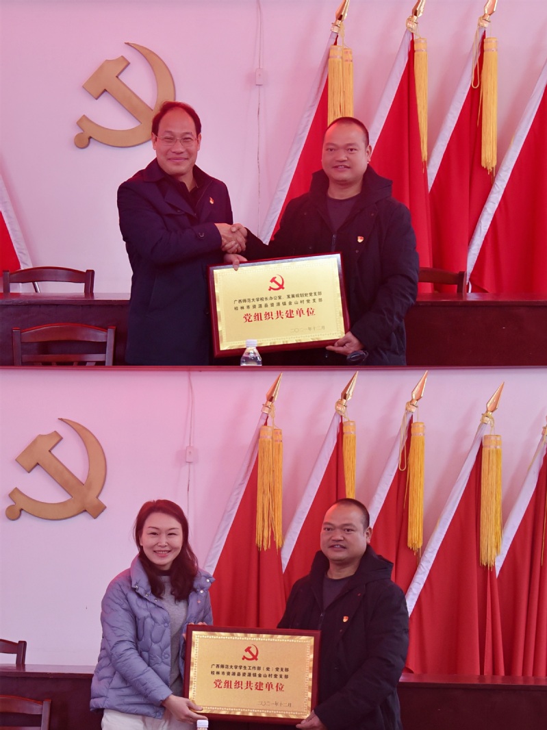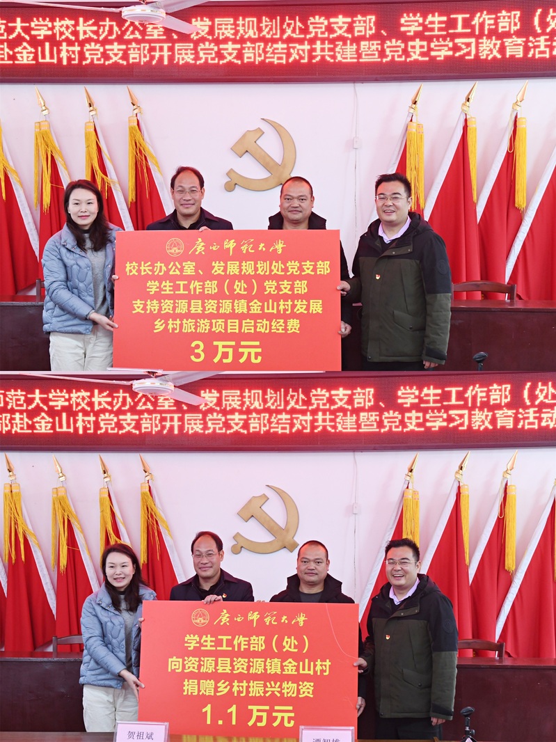 活动中,双方举行了党支部结对共建牌匾互授仪式、支持资源镇金山村发展乡村旅游项目捐赠仪式。校长办公室、发展规划处党支部和学生工作部(处)党支部分别与资源县资源镇金山村党支部结对共建,并支持了金山村发展乡村旅游项目启动经费和捐赠乡村振兴物资一批。各党支部也将继续加强结对共建,形成工作联动,全面推进支部党建工作再上水平,为助力乡村振兴,贡献师大力量与智慧。