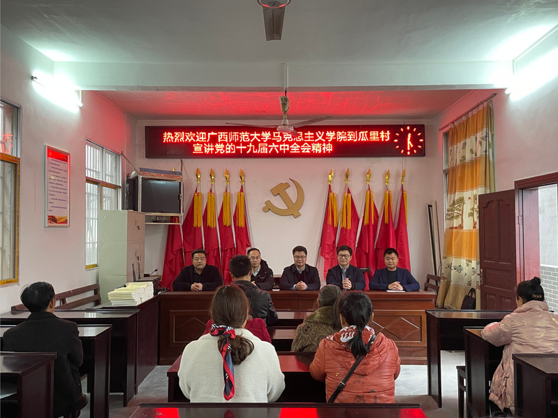 为深入学习贯彻落实党的十九届六中全会精神,让全会精神在基层走深走实、落地开花。12月16日,马克思主义学院作为后盾配合单位,发挥学科专业人才平台等优势,强化理论研究宣传阐释职责,赴资源县瓜里乡瓜里村开展十九届六中全会精神宣讲进基层活动,学院党委主要负责人、瓜里村村两委成员、驻村第一书记及村民党员代表40余人参加此次活动。