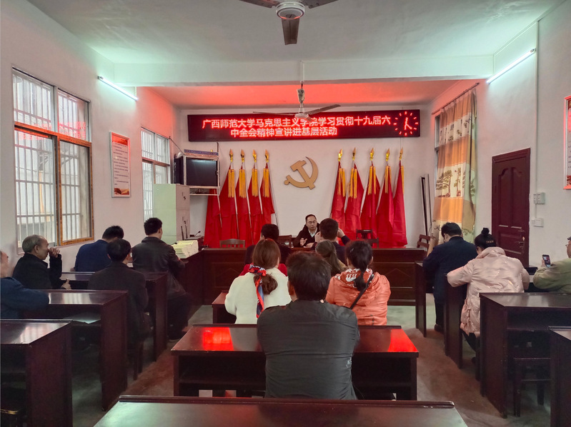 百年党史催人奋进,奋斗脚步永不停歇。马克思主义学院教师理论宣讲团成员卢俞成博士以《以史为鉴,勇担使命,开创未来----学习贯彻党的十九届六中全会精神》为主题给党员干部、父老乡亲们作了一堂生动的党课、精彩的辅导。他从全会审议通过的《中共中央关于党的百年奋斗重大成就和历史经验决议》和《中国共产党第十九届中央委员会第六次全体会议公报》原文关键点出发,用通俗易懂“接地气”的广西语言,丰富多样、喜闻乐见的鲜活案例解读党的十九届六中全会精神,带领瓜里村党员群众回顾百年大党取得的重大成就,从百年党史中汲取智慧和奋进力量。号召广大基层领导干部和党员要深入学习认真贯彻党的十九届六中全会精神,要深刻把握我们党制定《中共中央关于党的百年奋斗重大成就和历史经验的决议》的重大意义,要深刻把握党百年奋斗的伟大成就和历史意义,要深入理解党百年奋斗的历史经验,以史为鉴,勇担使命,开创未来,在巩固拓展脱贫攻坚成果和全面推进乡村振兴战略的道路上再创辉煌。