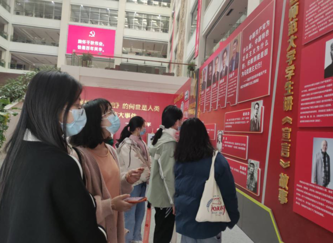 为持续推进党史学习教育,传承红色革命基因,12月17日,职业技术师范学院2021年青马班学员走进雁山校区图书馆,参观了《共产党宣言》版本展。