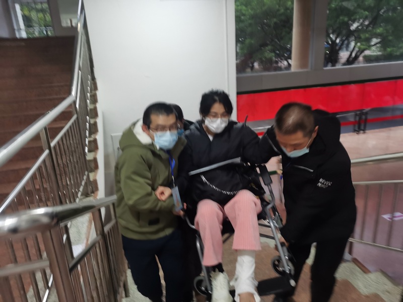 考务人员为考生服务抬轮椅上5楼