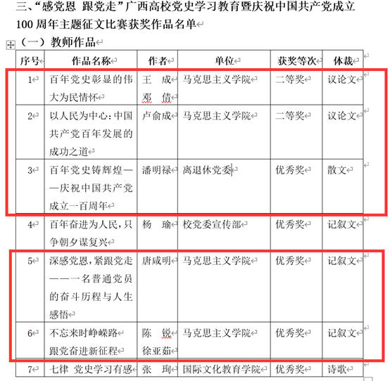 近日,自治区党委教育工委、自治区教育厅公布了“感党恩 跟党走”广西教育系统党史学习教育暨庆祝中国共产党成立100周年系列活动入选参展及获奖结果。在主题征文比赛中,我校马克思主义学院王成老师、卢俞成老师的作品荣获议论文二等奖,唐咸明老师、陈锐老师的作品荣获记叙文优秀奖,退休教师潘明禄的作品荣获散文优秀奖。