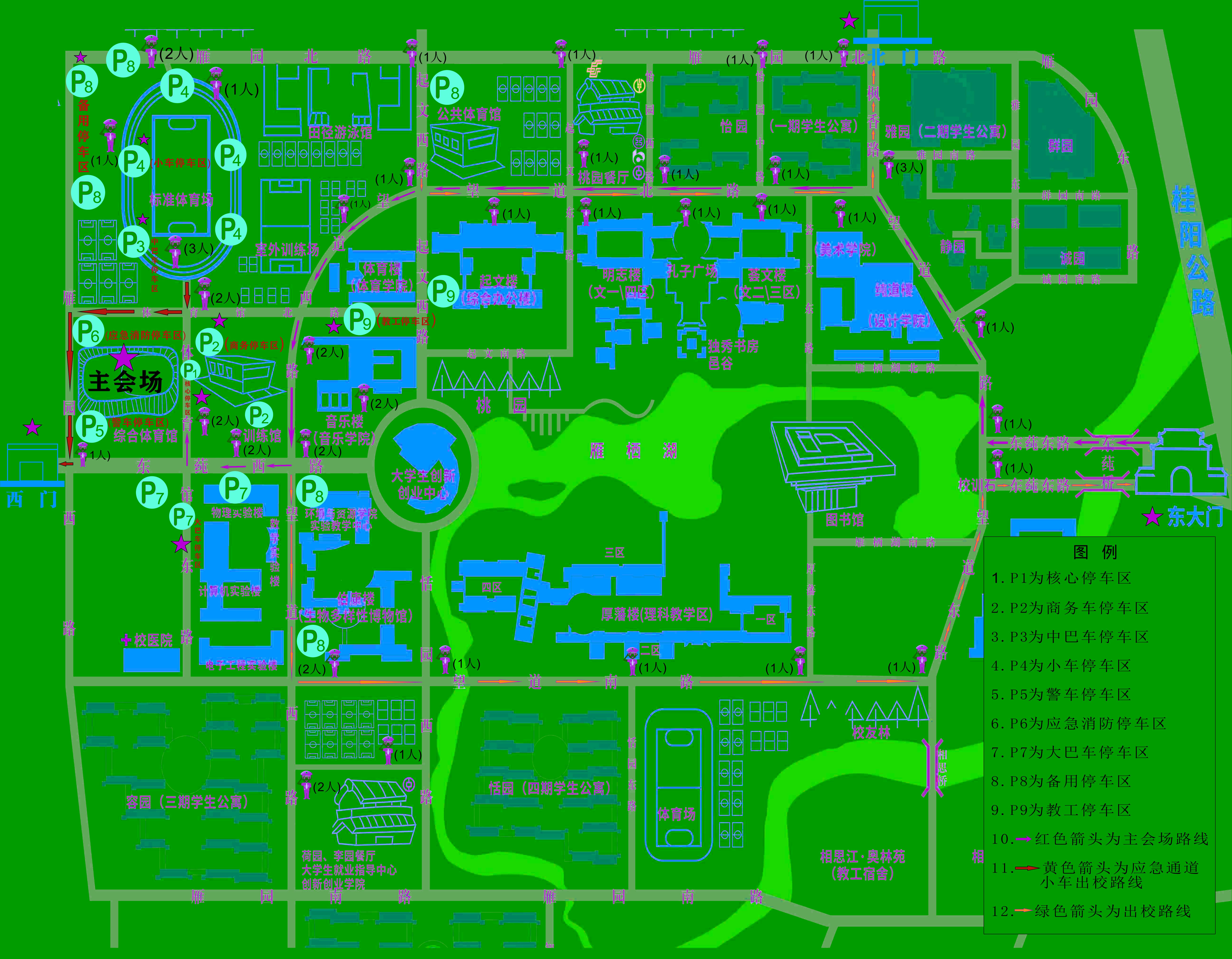 校庆庆祝大会及系列活动期间,校园及周边交通压力巨大,请教职工尽量不开车上下班。确因工作需要开车的教职工,按指定位置停放车辆和规定路线出入校,服从现场工作人员的指挥: