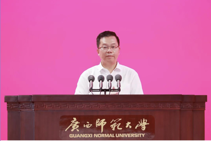 面向未来,我们要全面加强党的领导,育人为本,为培养时代新人,作出师大贡献;我们要强化学科建设,坚持“人才强校”战略,“聚天下英才而用之”,为打造区域性人才集聚高地和创新高地,汇聚师大力量;我们要心系“国之大者”,主动融入国家和区域战略,为促进国家和地方发展,彰显师大担当;我们要增强文化自信,讲好中国故事、广西故事,为文化传承创新,展示师大风采;我们要坚持开放办学,为中国—东盟命运共同体建设,展现师大作为!