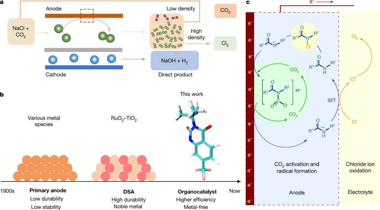 但是氯碱行业非常耗能,其能耗占到了全世界总发电量的4%(约150 TWh)。所以对该电解过程进行优化,是一项具有挑战性的工作,即便是轻微地提高该电解反应的效率也可以节约大量成本和能源。该电解过程的一个重要反应就是阳极的析氯反应(CER),对于该反应,最先进的电极仍然是几十年前开发的涂层钛阳极(DSA阳极)。鉴于此,我校化学与药学学院/省部共建药用资源化学与药物分子工程国家重点实验的潘英明教授/唐海涛副教授团队与清华大学李亚栋院士/王定胜副教授团队合作发现酰胺类有机小分子修饰后的电极,在二氧化碳气体的催化下可以极大地促进CER。他们发现在10 kA m-2的电流密度下过电位仅为89 mV,可以实现99.6%的反应选择性;相比于电极直接的CER,酰胺与二氧化碳形成的N-COOH中间体可以起到一个间接氧化产生氯自由基的作用(类似于Kolbe电解机理)。