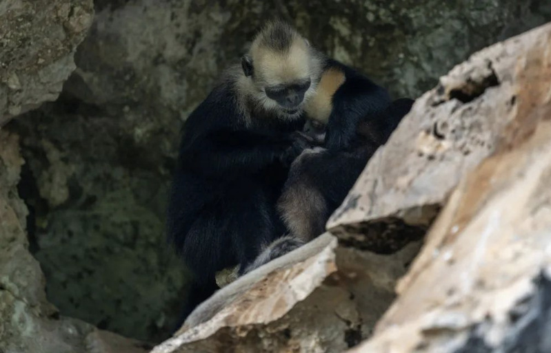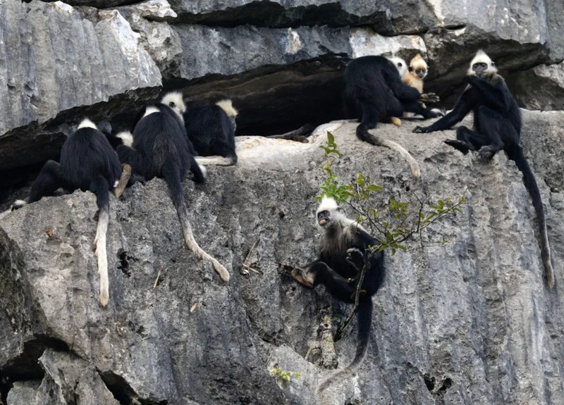 白头叶猴,顾名思义,头顶一撮白毛,是我国特有的国家一级重点保护野生动物,种群数量甚至比大熊猫还稀少,主要分布在崇左市左江和明江之间不足200平方公里的喀斯特石山地区,它还有个好听的名字叫“石山精灵”。