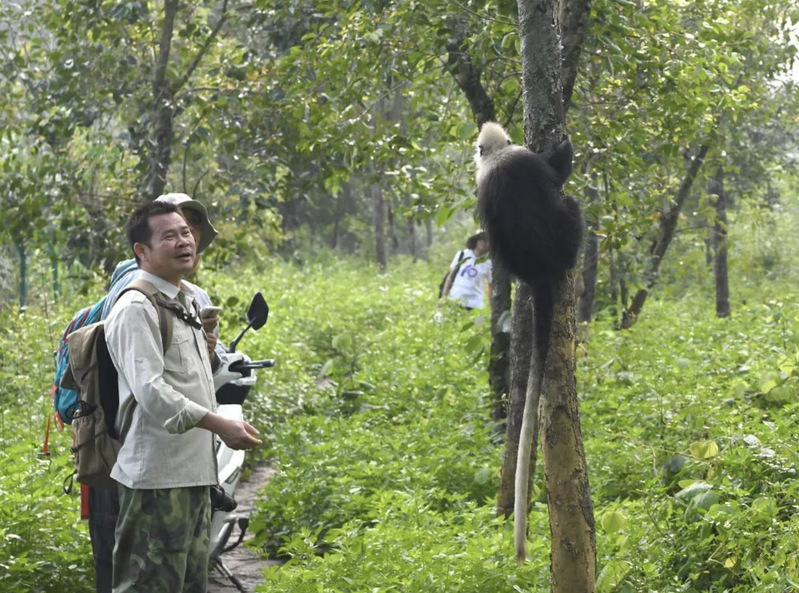 此时,护林员梁志章也来到树林,和李文钦、刘彦辰一起开心地看着猴群在林间“翩翩起舞”。他是保护区所在地的村民,加入护林员的行列已有十五六年。梁志章告诉记者,以前白头叶猴绝不会和人走那么近:“小的时候只能在野外听见猴子的叫声,猴子那个时候比较怕人。”