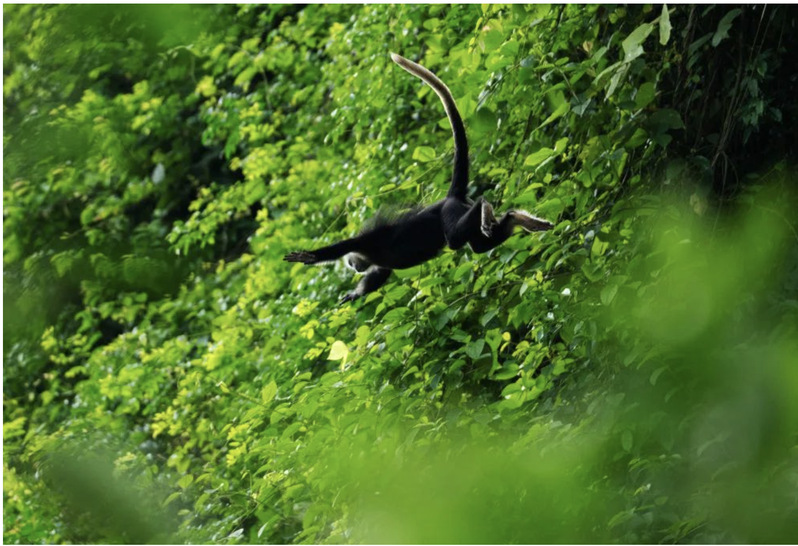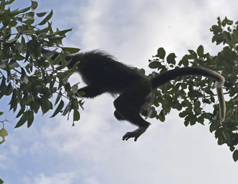 休息一段时间后,猴群开始往山下移动,倏忽之间,就来到了记者所在的树林,只听得树叶哗哗作响,它们从一根树枝跃向另一根树枝,用手抓住树枝并利用下坠时树枝的弹力又向上高高飞起,飞向更远的树枝。弹跳飞跃之间,宛若一个个精灵在林间翩翩起舞,舞姿迅捷曼妙,让人叹为观止。有的猴子甚至下到地面,从记者身边跑过。