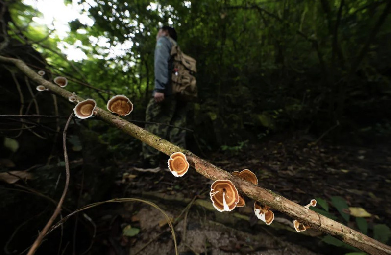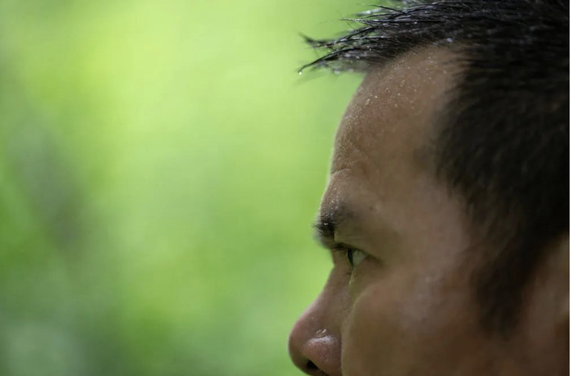 梁志章在保护区巡视时,头发和脸被雨水打湿(8月4日摄)。