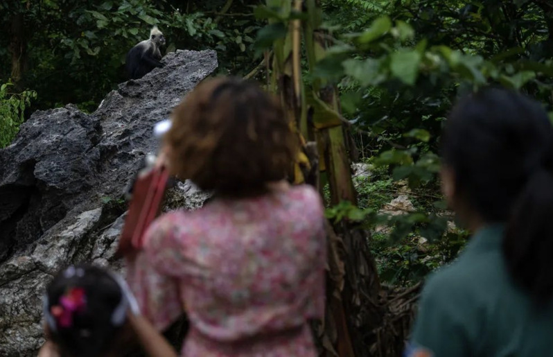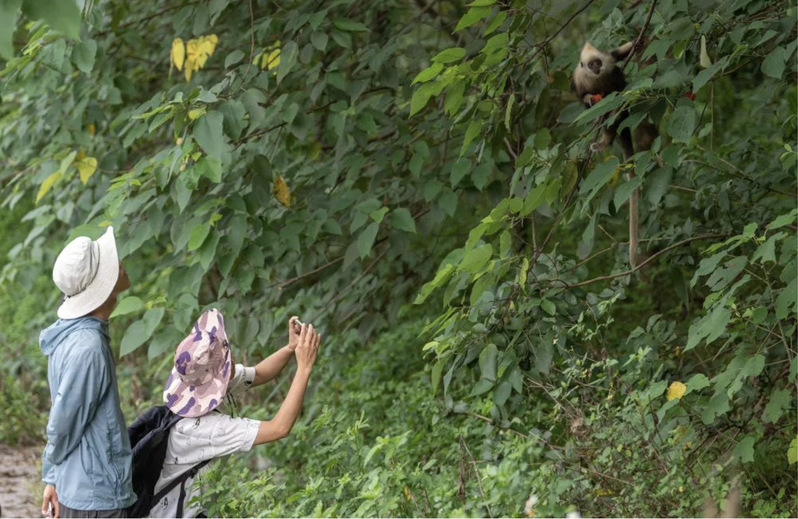 8月5日,游客在白头叶猴国家级自然保护区板利片区拍摄白头叶猴。