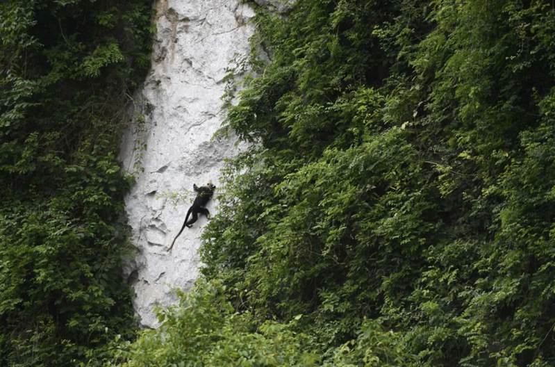 一只白头叶猴在石壁上攀爬(8月5日摄)。