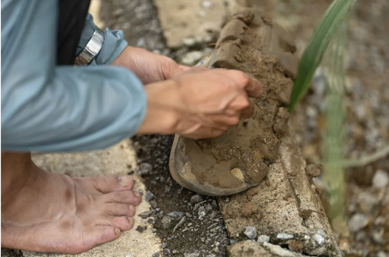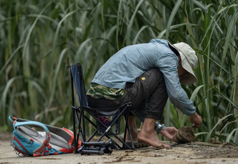 8月5日,李文钦从树林中出来后,清理鞋上的泥巴。