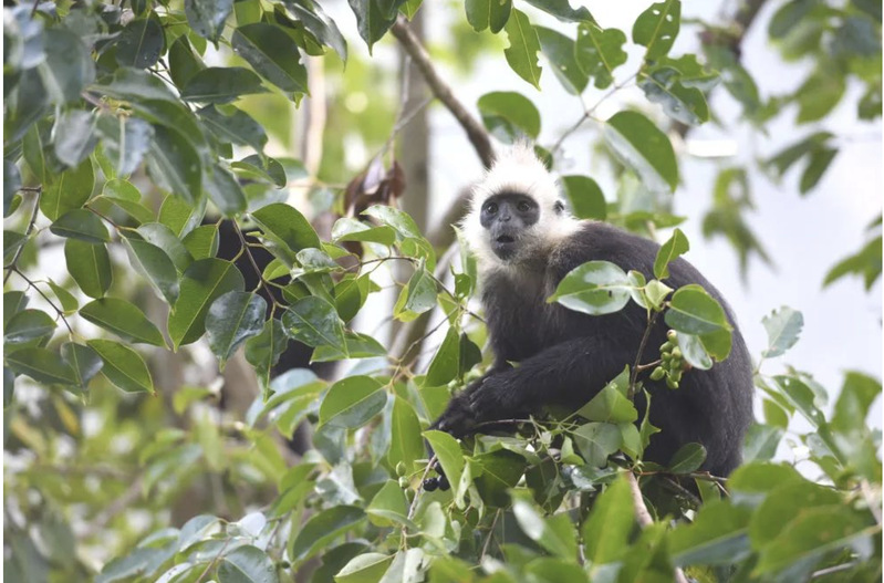 原来,记者所在的这片树林是保护区专门种植的食源植物园,里面种了苹婆、构树、灰毛浆果楝……都是白头叶猴喜欢吃的植物。此时正是构树和海南蒲桃成熟的时节,猴子们在树上大快朵颐起来。