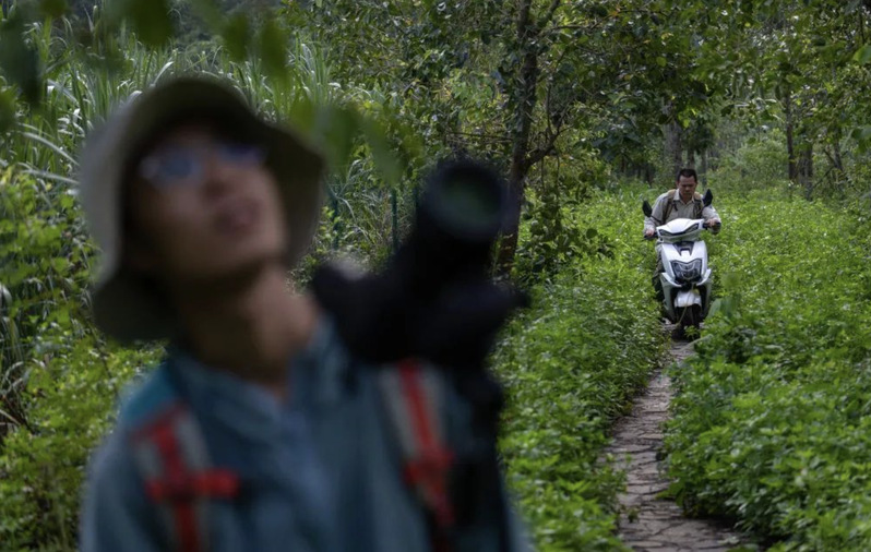 梁志章在近距离观察白头叶猴活动(8月5日摄)。