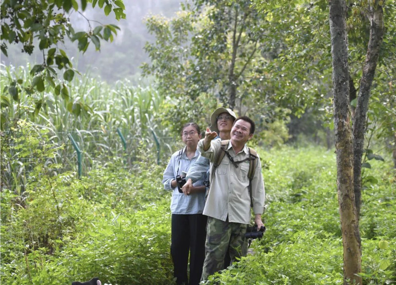 8月5日,护林员梁志章(右一)和广西师范大学研究生李文钦(中)、刘彦辰在观察白头叶猴活动。