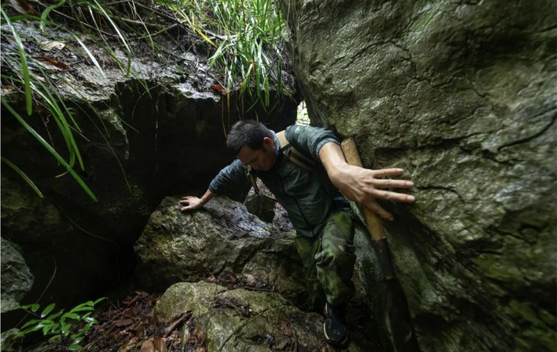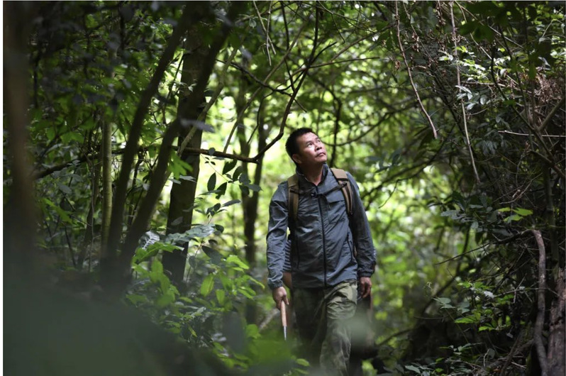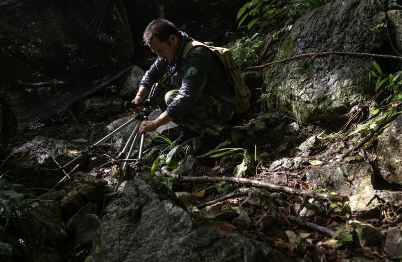 梁志章在保护区巡视时,把猴群或者其它动物撞倒的红外线相机扶起来(8月4日摄)。