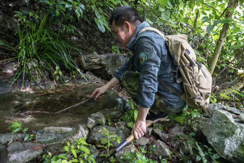 梁志章在保护区巡视时,清理专门为白头叶猴修的饮水池(8月4日摄)。
