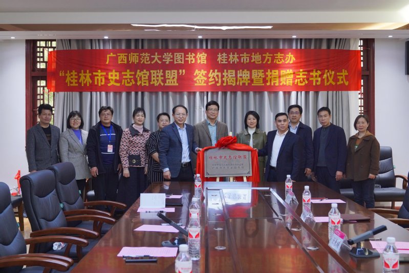 为进一步促进方志文化交流,充分发挥地情资料的教化育人作用,3日20日,广西师范大学图书馆和桂林市地方志编纂委员会办公室在王城校区举行“桂林市史志馆联盟”签约揭牌暨捐赠志书仪式。广西师范大学图书馆领导班子成员、社科处、历史文化与旅游学院部分师生代表,桂林市地方志办领导班子成员、桂林各县(市、区)地方志机构负责人等近60人参加了仪式活动。