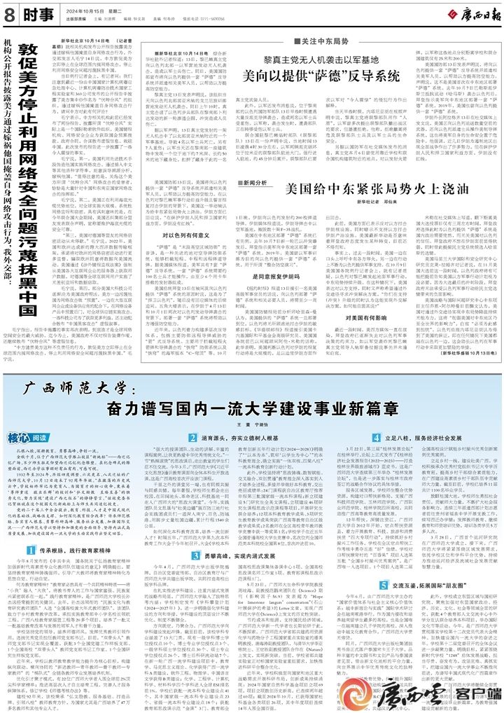 今日,《广西日报》第八版、广西云—广西新闻网等平台用“广西师范大学:奋力谱写国内一流大学建设事业新篇章”为标题,从“传承师范根脉、夯实育人根基、勇攀科研高峰、服务社会发展、加强国际交流”等方面,概括性总结学校近年来高水平学科建设和学校高质量发展成果。回望92年奋斗路,擘画广西师范大学发展新蓝图,奋力谱写国内一流大学建设事业新篇章,为教育强国建设贡献新的力量,我们凝心聚力、砥砺前行!