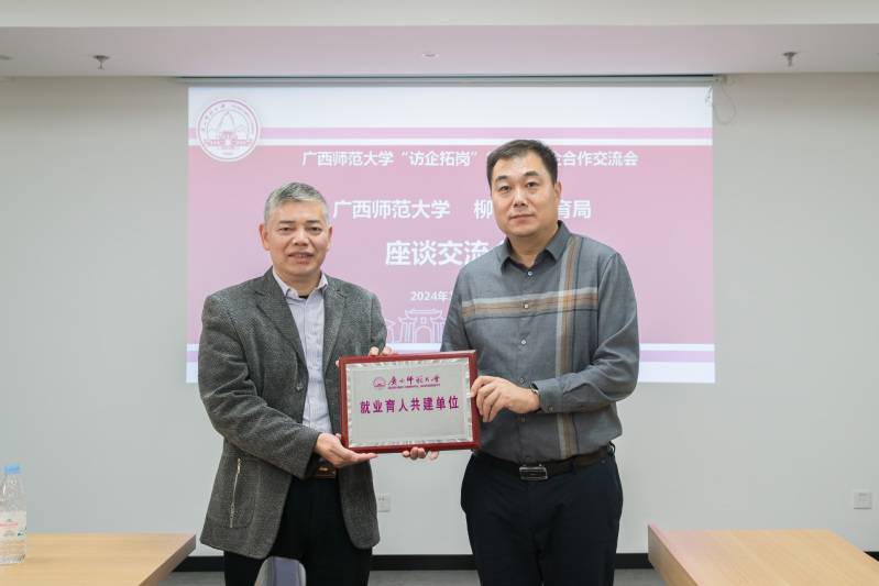 座谈会上,柳州市教育局市委教育工委副书记、市教育局党组书记、局长潘旭阳及相关负责人分别就柳州市教育事业发展情况、产教融合特色、基础教育和职业教育建设成果、教师人才具体需求等做了系统介绍。莫坷副书记详细介绍了学校的办学历史及特色、专业建设与人才培养等情况,并开展2025届毕业生推介,期望与柳州市教育局在基础教育教学、学生社会实践、人才联合培养、教师培训等领域开展更为深入的合作交流。座谈会最后,莫坷副书记向柳州市教育局授予“就业育人共建单位”牌匾。