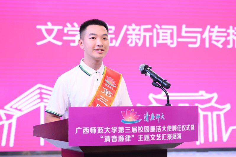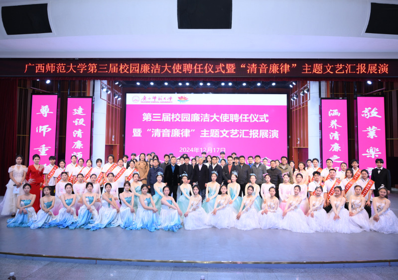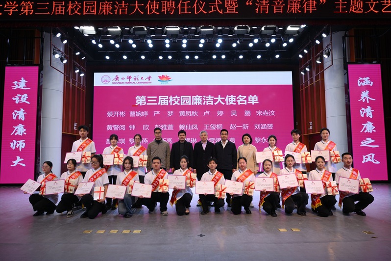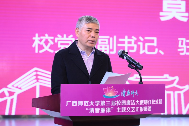 为传承廉洁文化,选树廉洁榜样,建优清廉建设品牌集群,推进“清廉师大”建设提质增效三年行动,12月17日,我校在雁山校区音乐楼三楼综合厅举办第三届校园廉洁大使聘任仪式暨“清音廉律”文艺主题汇报展演活动。该活动由“清廉师大”建设工作领导小组主办,党风廉政办/党委巡察办、校团委、音乐学院共同承办。校党委副书记、驻校纪检监察组组长莫坷出席活动并讲话。“清廉师大”建设工作领导小组办公室成员、各“廉·行”廉洁文化建设示范项目立项单位代表,第三届校园廉洁大使、各校级学生组织代表、校级学生社团代表、院级学生组织代表参加活动。