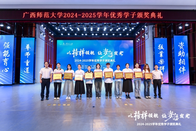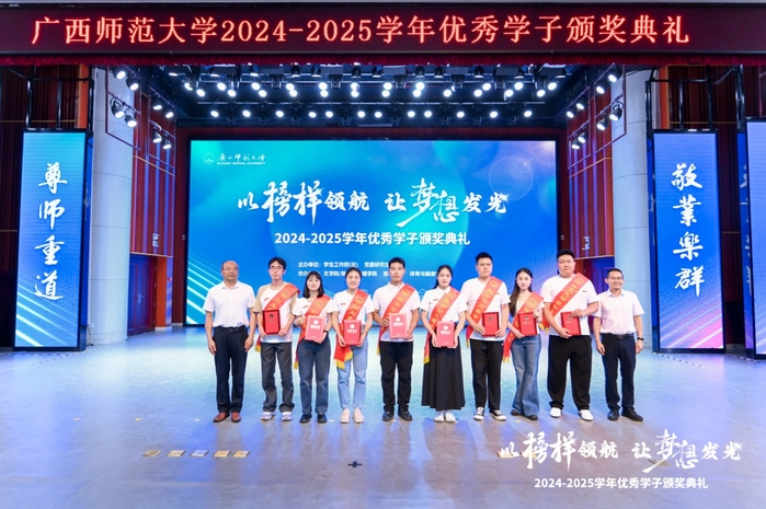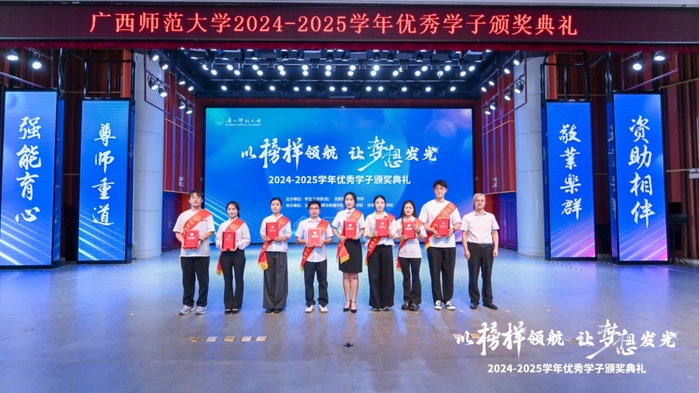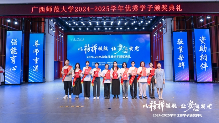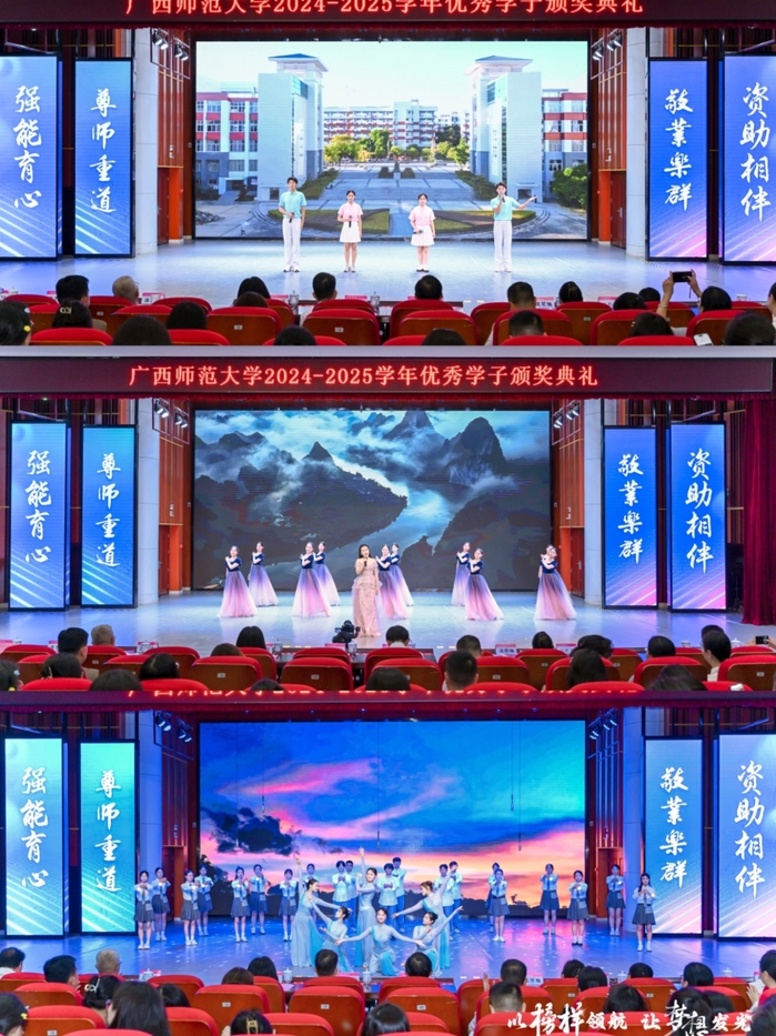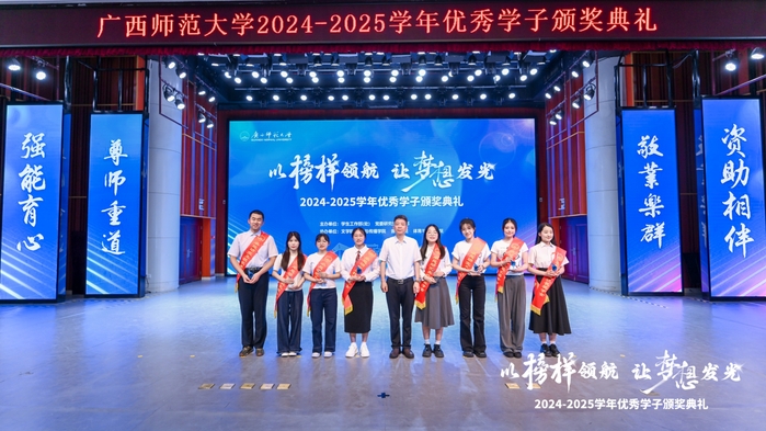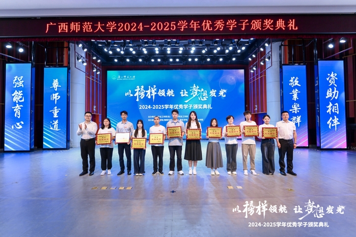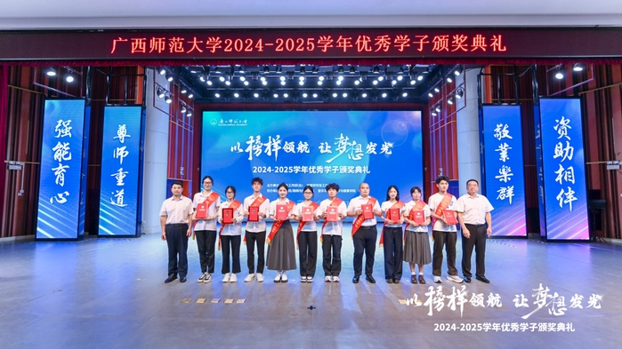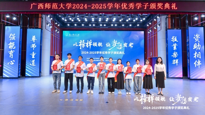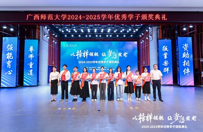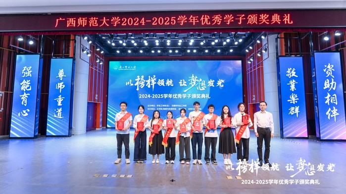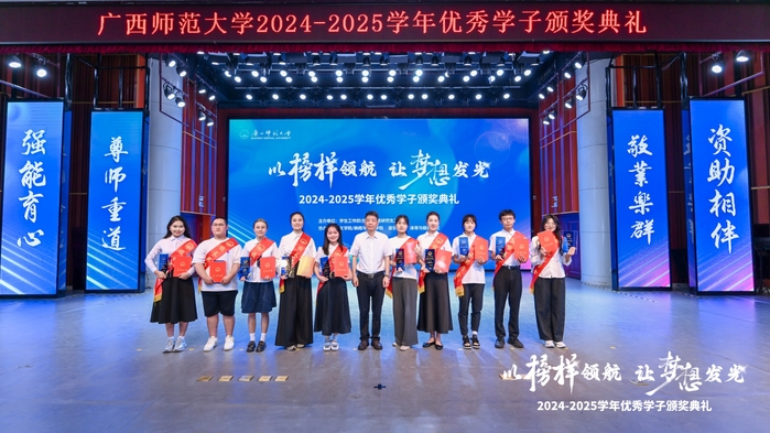典礼现场,孙杰远为本科生校长奖学金、卓越研究生校长奖学金颁奖。汤志华、沈星灿为国家奖学金、国家励志奖学金、自治区人民政府奖学金奖项颁奖。汤志华宣读《广西师范大学2024-2025学年先进集体、先进个人表彰的决定》。