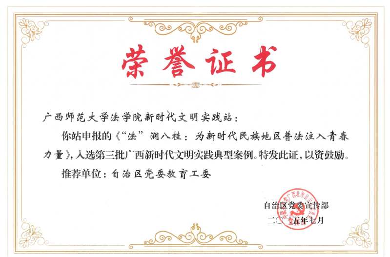 近日,自治区党委宣传部发布第三批广西新时代文明实践典型案例,由广西师范大学法学院新时代文明实践站申报、自治区党委教育工委推荐的《“法”润八桂:为新时代民族地区普法注入青春力量》项目从全区高校及各地市教育机构推荐的众多项目中脱颖而出,成功入选,成为唯一获奖的学校单位。