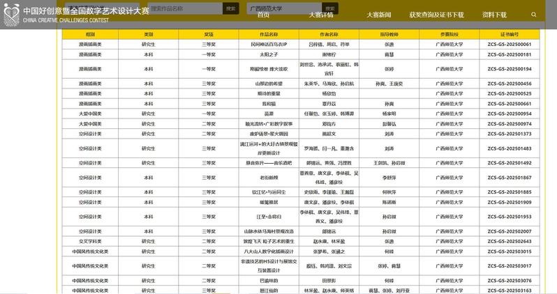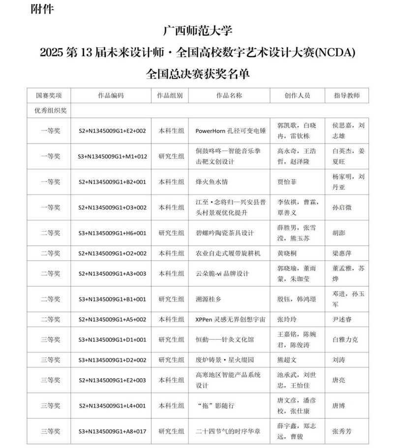2025第十三届未来设计师·全国高校数字艺术设计大赛(NCDA)由工信部人才交流中心主办,是高校积极参与的重要竞赛之一,入选教育部中国高等教育学会发布的《全国普通高校学科竞赛分析报告》赛项(国家A类大赛)。在这场激烈的较量中,设计学院成绩斐然,全国总决赛斩获16项荣誉,含一等奖4项、二等奖5项、三等奖7项;广西赛区竞赛揽获110个奖项,包括一等奖25项、二等奖47项、三等奖38项。
