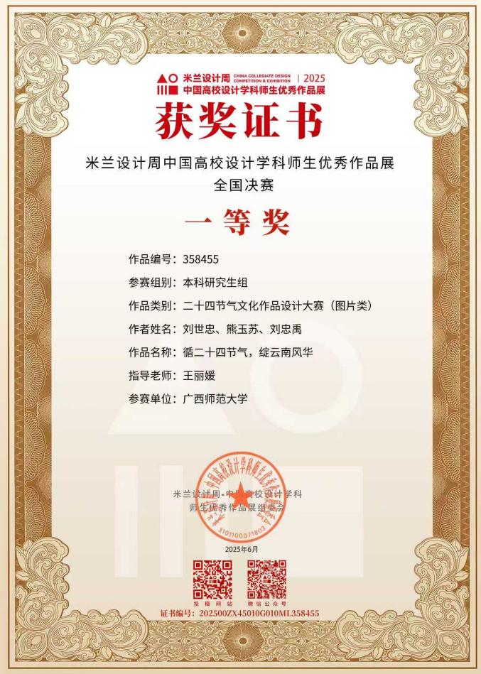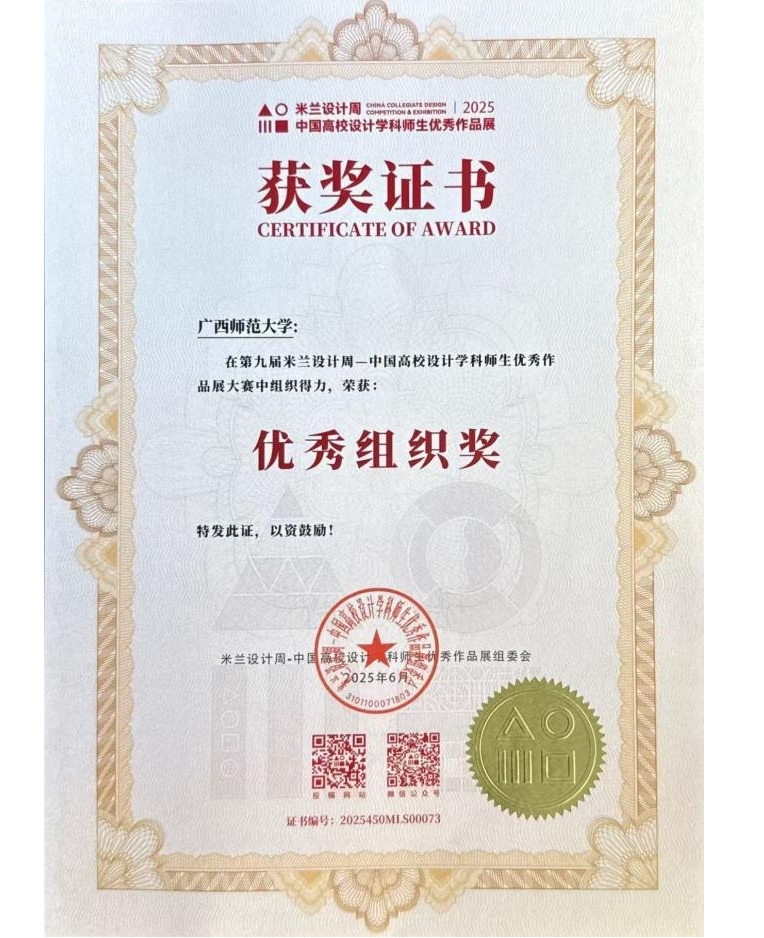 米兰设计周——中国高校设计学科师生优秀作品展,由中国高等教育学会和中国教育国际交流协会联合发起主办,是中国高校设计学科的重要赛事,已连续五年被纳入“全国普通高校大学生竞赛排行榜”A类赛事,是教育部官方认可的设计学科极具含金量的国家级赛事之一。设计学院学子在此次赛事中表现出色,共斩获112项奖项,其中国赛一等奖1项、二等奖6项、三等奖13项;广西分区赛一等奖15项、二等奖46项、三等奖31项,广西师范大学还荣获“优秀组织奖”。