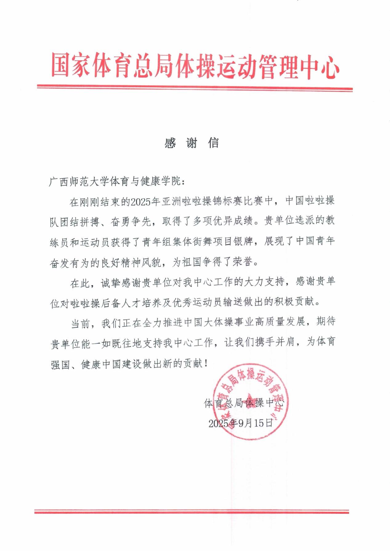 国家体育总局体操运动管理中心贺信