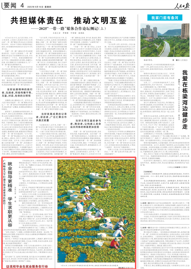 9月18日,《人民日报》04版要闻版推出报道:《广西师范大学打通全链条就业帮扶路径——就业指导更精准 学生求职更从容》,关注报道我校近年来以学生职业发展需求为导向,打通从专业认知到职业发展的全链条就业帮扶路径,开展就业帮扶的经验做法。如何结合实际精准施策?广西师大搞好“一本账”、做好个性化方案,不断增强学生综合素质……学子就业更从容,广西师大一直在行动。