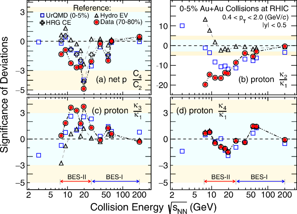 本工作基于RHIC第二阶段束流能量扫描所采集的7.7–27 GeV金核-金核碰撞数据,系统分析了净质子数分布的高阶累积量,发现在碰撞能量19.6 GeV附近,该累积量显著偏离非临界模型基线,偏离置信度达到2–5倍标准差,可能是理论预言中QCD临界点存在的一个特征信号。目前,针对更高重子密度区域的STAR固定靶实验数据(3–4.5GeV)的分析工作也在持续推进中,结合对撞实验测量预计将为寻找QCD临界点提供更准确的实验依据。