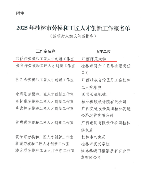 近日,桂林市总工会发布2025年桂林市劳模和工匠人才创新工作室认定通报,由广西师范大学生命科学学院邓荫伟教授领衔的“邓荫伟劳模和工匠人才创新工作室”成功入选,成为2025年全市10个获此殊荣的工作室之一。