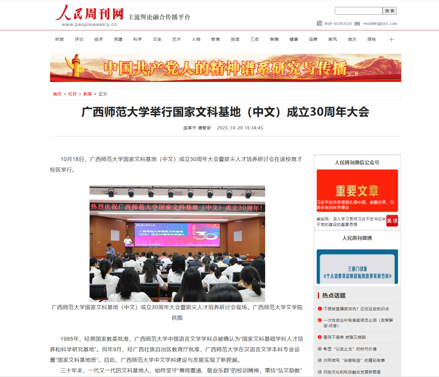 近日,【人民周刊】【桂林日报】关注报道我校举行国家文科基地(中文)成立三十周年庆祝典礼暨拔尖人才培养研讨会。该基地于1995年经原国家教委及广西壮族自治区教育厅批准设立,推动学校中文学科实现新跨越。