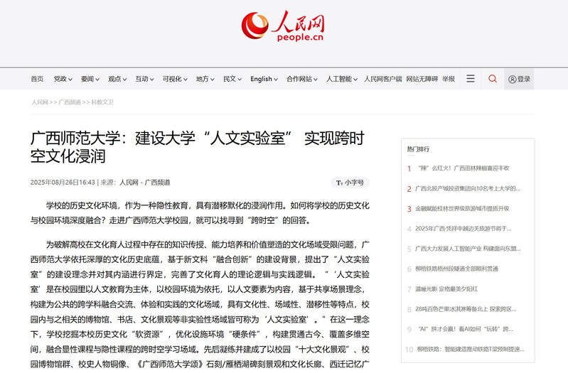 近日,【人民网-广西频道】关注报道我校建设大学“人文实验室”实现跨时空文化浸润。为破解高校在文化育人过程中存在的知识传授、能力培养和价值塑造的文化场域受限问题,我校依托深厚的文化历史底蕴,基于新文科“融合创新”的建设背景,提出了“人文实验室”的建设理念并对其内涵进行界定,完善了文化育人的理论逻辑与实践逻辑,打造以“资源共享、包容开放、交叉融合、个性体验”为特征的校园文化育人空间,探索显性教育和隐性教育相统一的跨时空文化育人新模式。