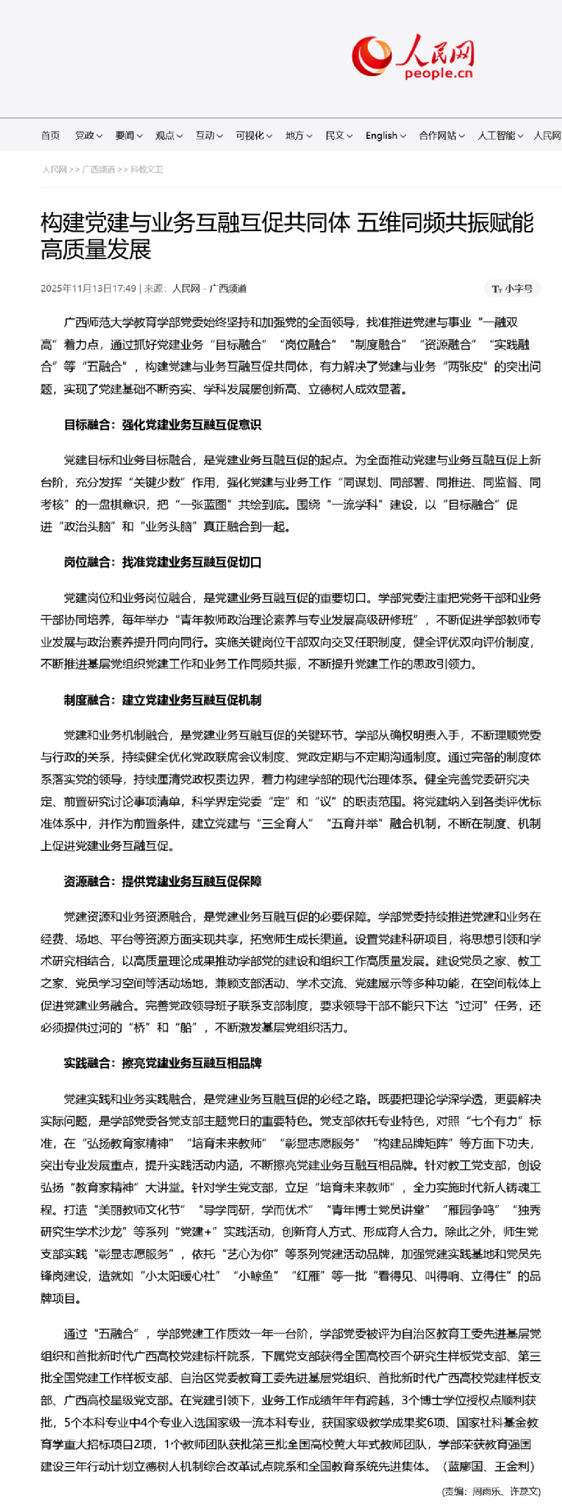 近日,【人民网】关注报道我校教育学部党建与业务融合发展的创新实践。学部党委始终坚持党的全面领导,找准党建与事业“一融双高”着力点,通过“五融合”构建互融互促共同体,既夯实了党建基础,又推动学科发展、立德树人等业务工作屡创佳绩,为高校党建与业务深度融合提供了可借鉴的实践样本。