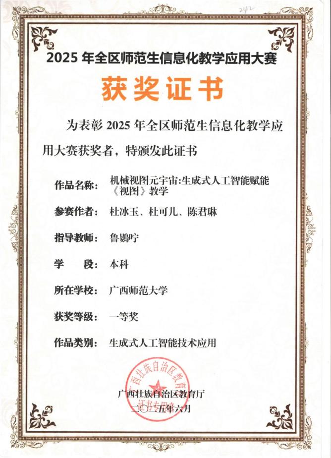 与此同时,本科组同样传来捷报。由鲁鷃咛老师指导,杜冰玉、杜可儿、陈君琳共同完成的作品《机械视图元宇宙:生成式人工智能赋能〈视图〉教学》,在生成式人工智能技术应用类比赛中荣获一等奖。该作品创新运用元宇宙与生成式AI技术,重构传统机械视图教学内容,展现了本科生在信息化教学工具开发与应用方面的卓越潜力。